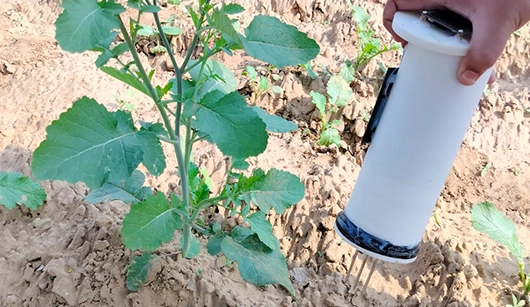 The device measures soil NPK levels and recommends fertilizer use based on crop type, soil conditions, and land size.